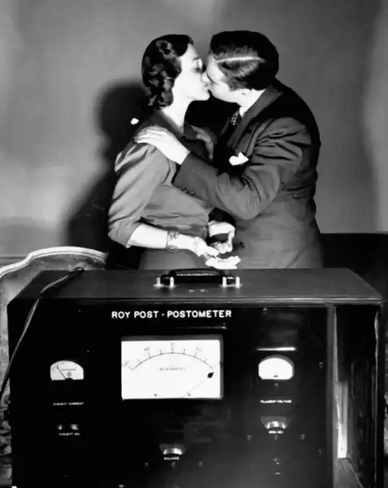 22. Молодая пара целуется, измеряя при этом на детекторе лжи степень эмоциональной реакции, 1939 год. Как видим, показания зашкаливают.