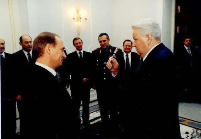 Ельцин дарит Путину ручку, которой был подписан его указ об отставке, 1999 год