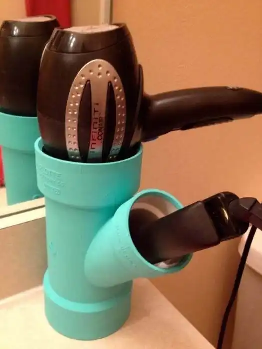 Тройники для наружной канализации – это практически готовые подставки для фена и утюжка. Остается только покрасить в симпатичный цвет и закрепить держатель в удобном месте. Еще один вариант хранения плойки и щипцов для завивки – закрепить обрезки трубы на дверце шкафа.