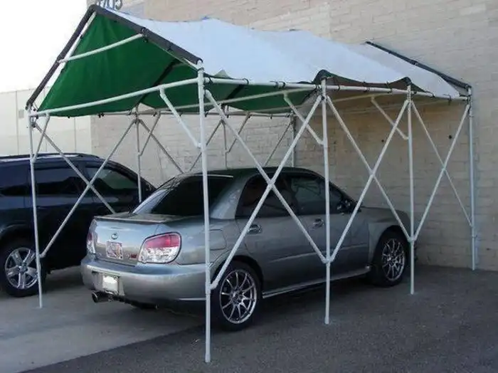 Для защиты автомобиля от солнца и дождя на даче можно соорудить очень простой навес, соорудив каркас из труб ПВХ и натянув сверху плотную ткань. Для устойчивости конструкцию крепят к стене или вкапывают в землю.