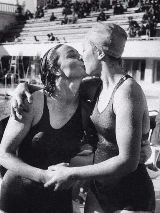 Пловчихи поздравляют друг друга с успешным выступлением на Спартакиаде, СССР, 1956 год.