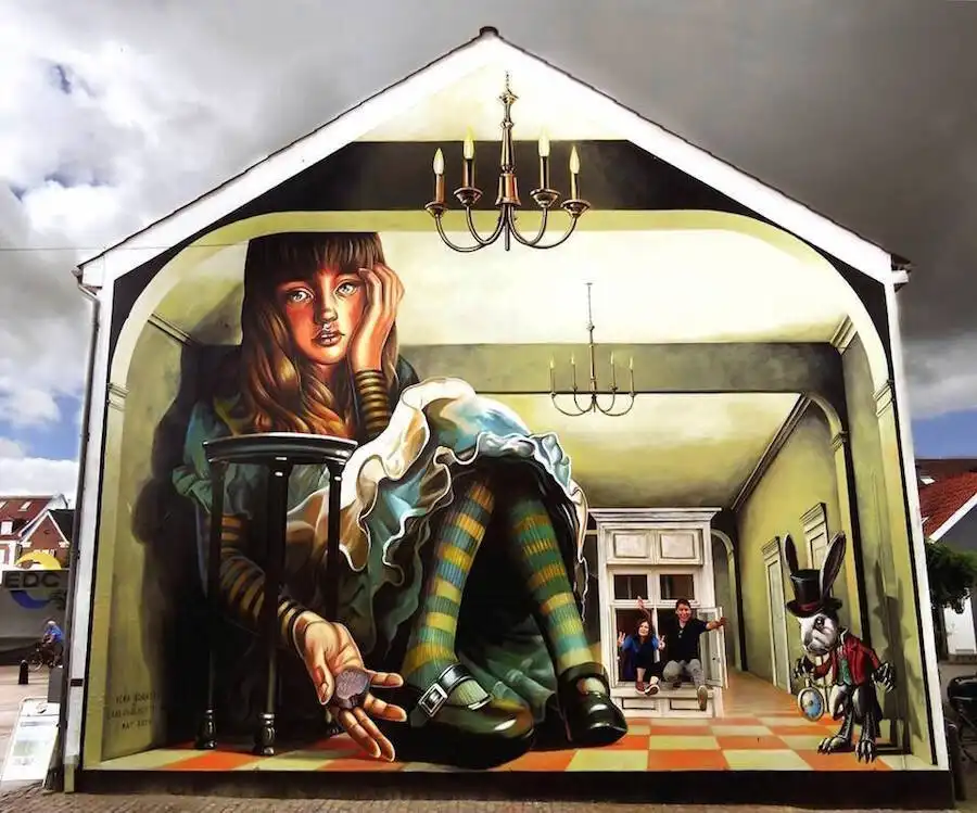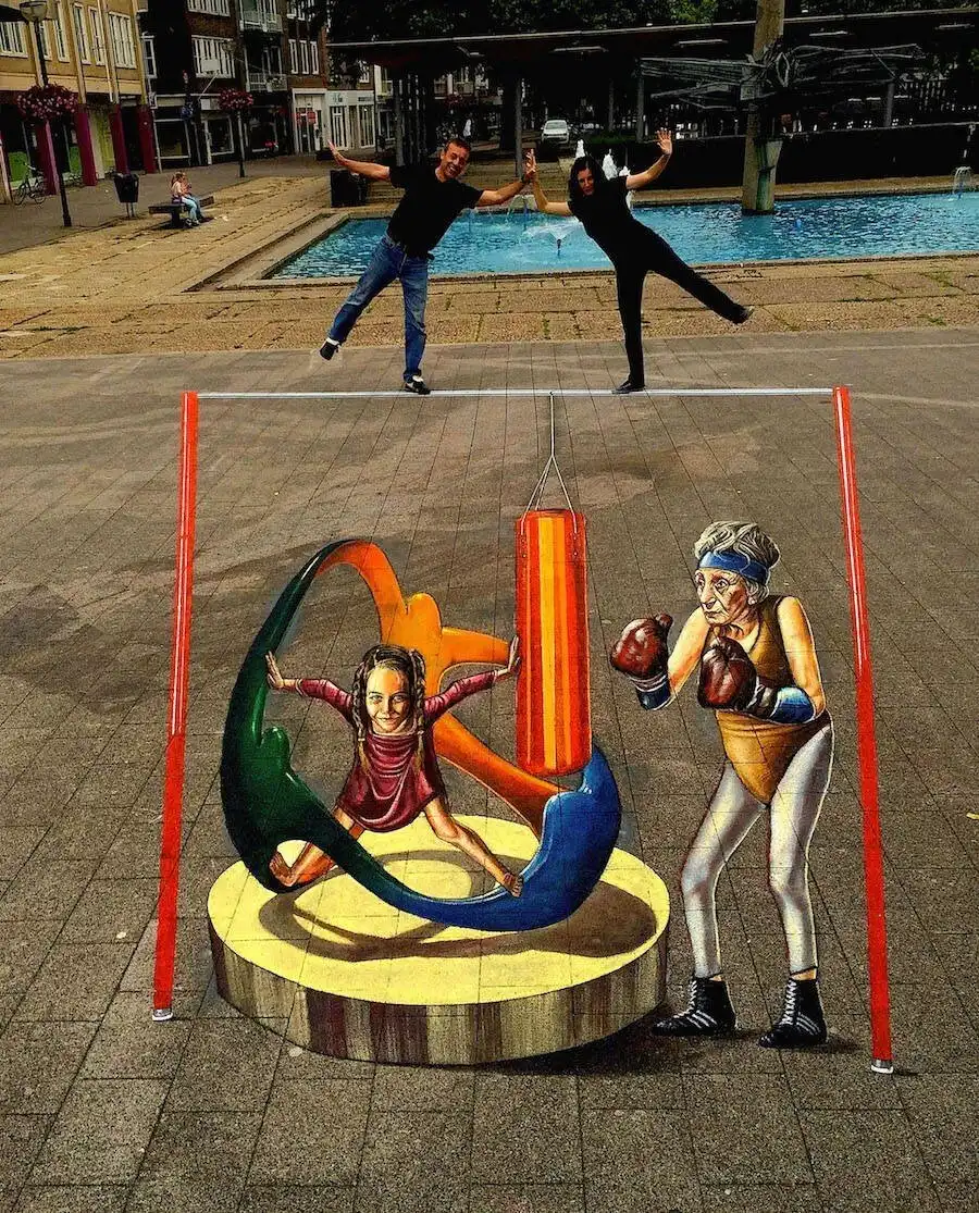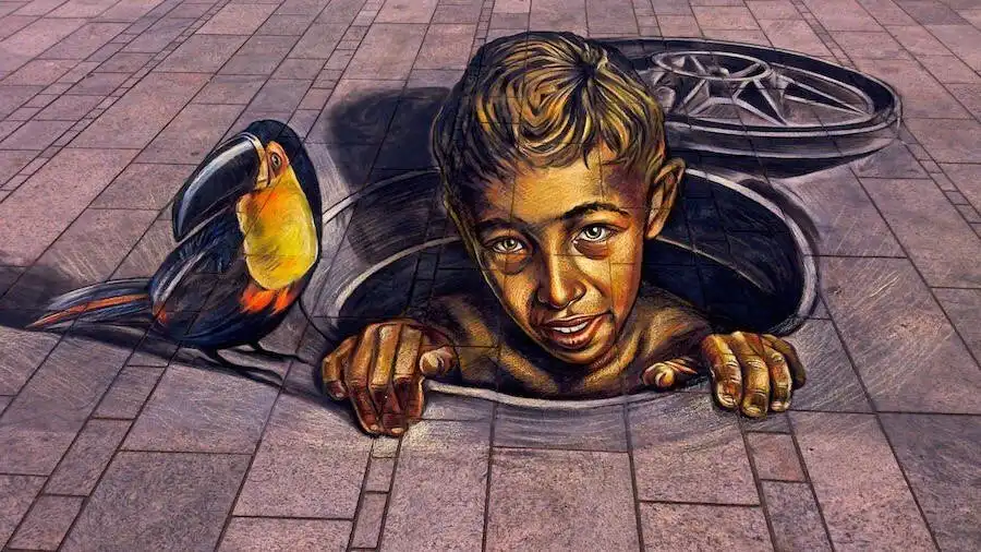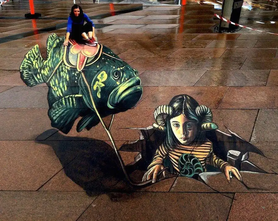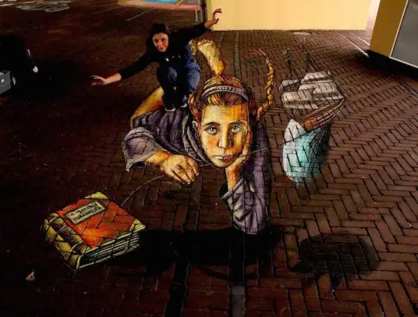 Художница из Италии Вера Бугатти (Vera Bugatti) создает трехмерные картины на социальную тематику прямо на улицах города. Также персонажей для своих картин она берет из книг, так как кроме художественной деятельности работает библиотекарем.