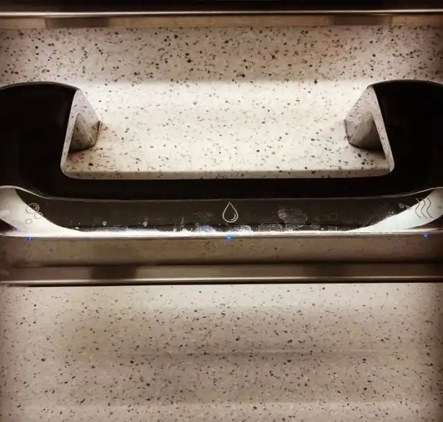 В этом общественном туалете мыло, вода и горячий воздух подаются из одной стойки над раковиной