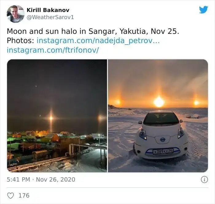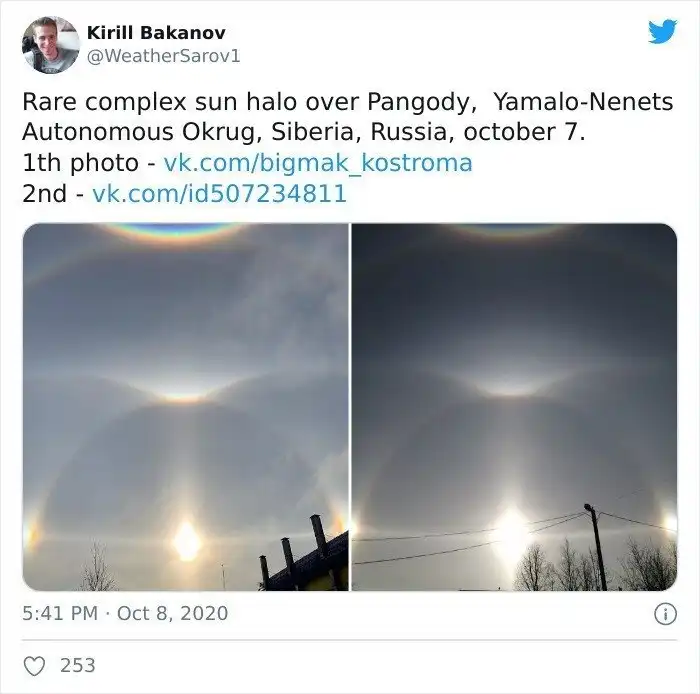 6. Редкое сложное солнечное гало над поселком Пангоды, Ямало-Ненецкий автономный округ, Сибирь. 7 октября 2020 г.