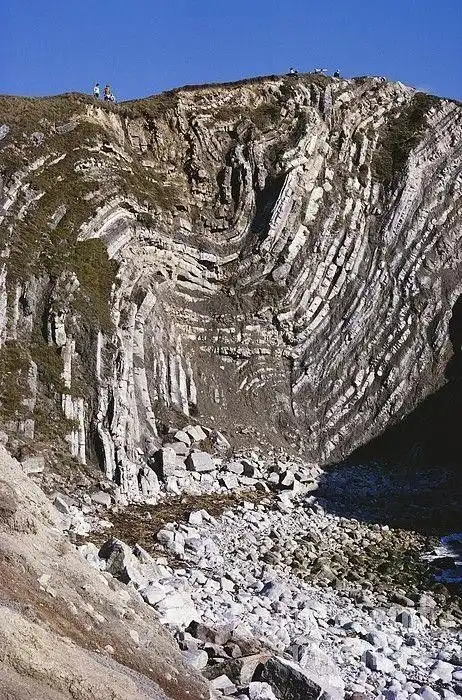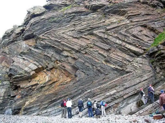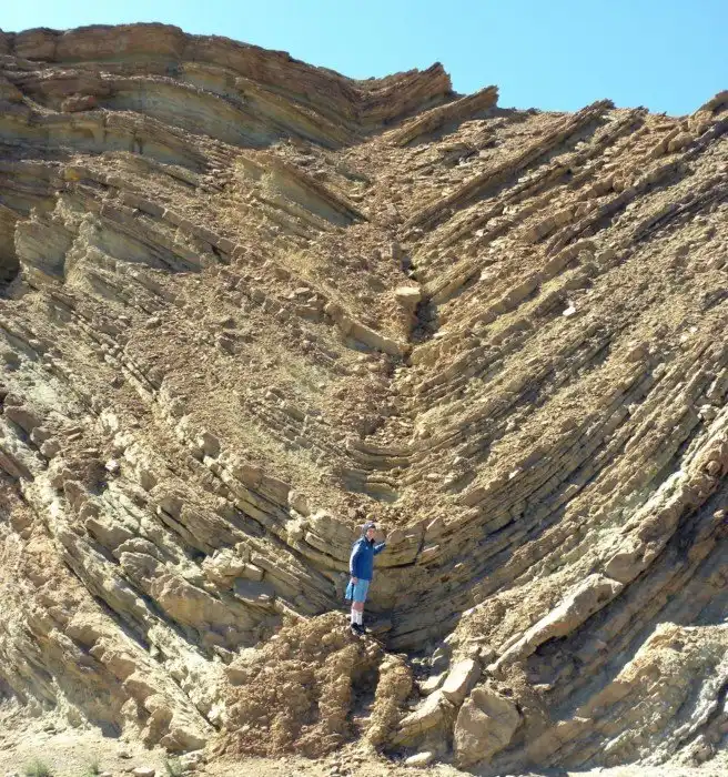 А вот еще складчатая дислокация — это деформация горных пород, происходящая после их первоначального отложения, выражающаяся в виде изгибов без заметных разрывов.