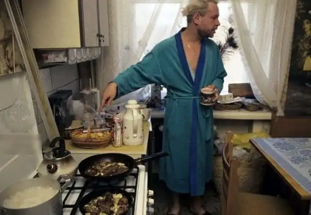 Борис Моисеев стоит на кухне в своей квартире и возмущается качеством печенья, купленных им накануне, Москва 1994 год
