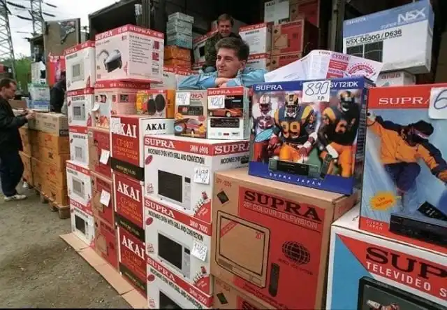 Кассир проверяет у покупателя наличие московской прописки при продаже дефицитного товара. Москва, 1990 год.