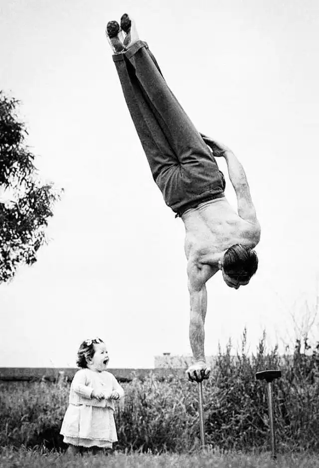 Папа демонстрирует свое мастерство на удивление маленькой дочери. Мельбурн, Австралия, 1940 год.