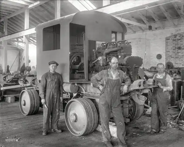 Сборка тяжелых грузовиков Fageol на заводе в Окленде, Калифорния, 1918 год.
