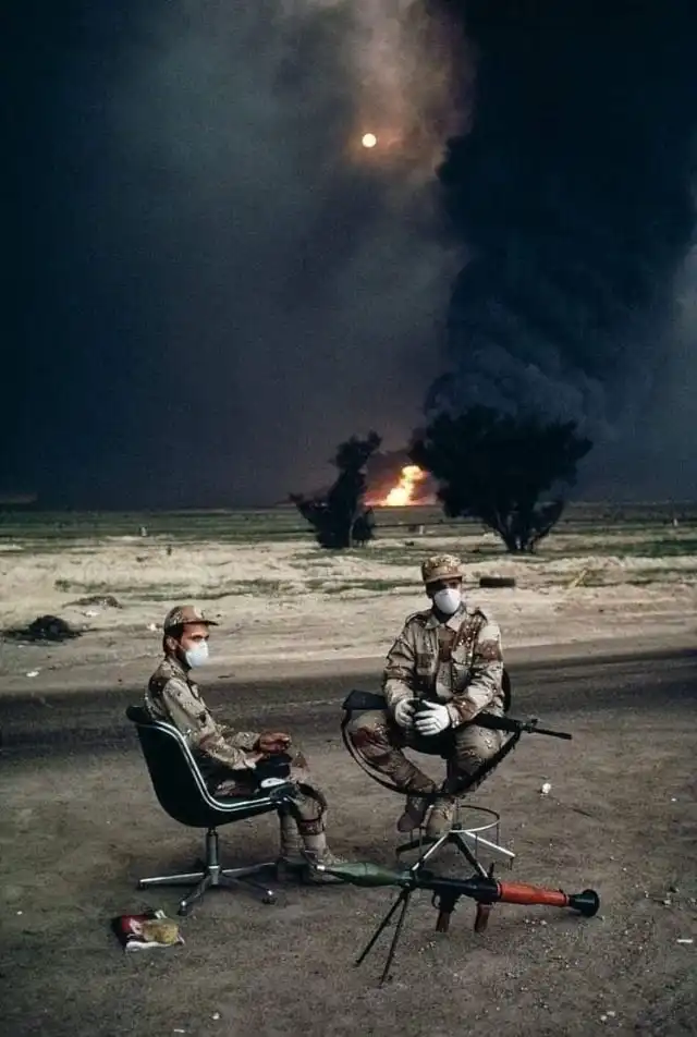 Кувейтские солдаты на фоне горящей нефтяной скважины. Война в Персидском заливе, 1990 год.