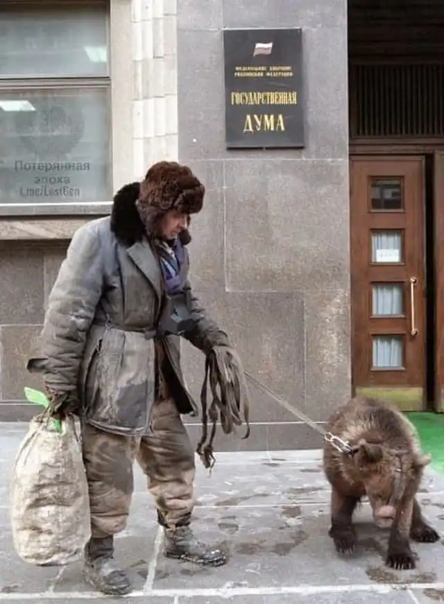 Мужчина с медведем прогуливается у здания Государственной Думы, 1998 год
