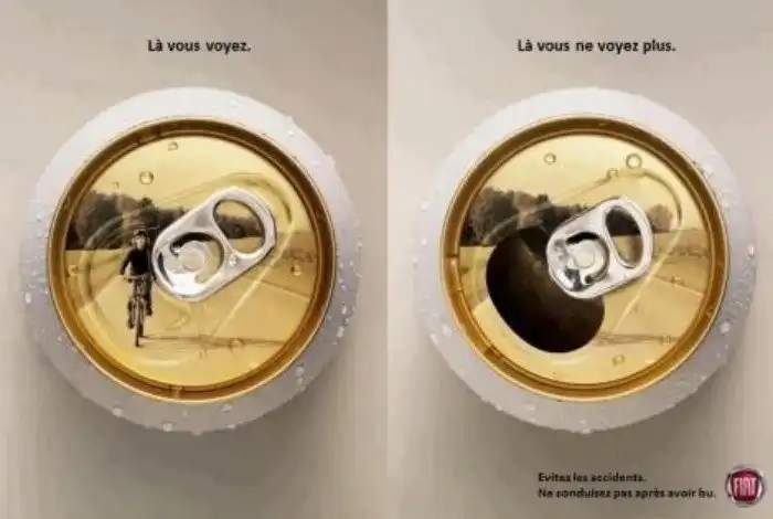 Реклама против алкоголя. Фраза слева: "Сейчас вы видите это", фраза справа: "а теперь нет".