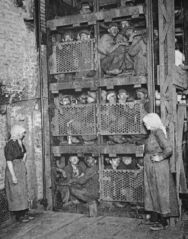 Бельгийские шахтеры спускаются с помощью лифта в шахту, 1900 год