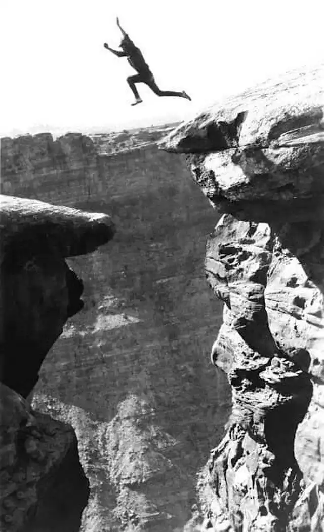 Мужчина прыгает с одного уступа на другой в Гранд-Каньоне, 1900-е.