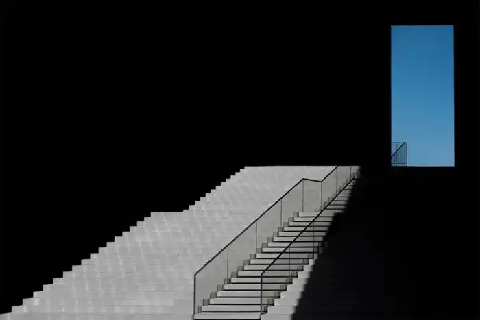 Снимок сделан в отеле Hyatt в Дюссельдорфе, Германия. Лестница поднимается к окну, из которого видно ясное голубое небо. Лестница и окно как будто парят в пространстве.