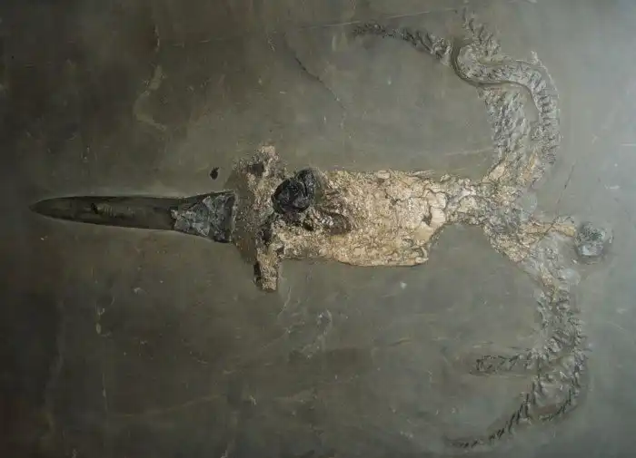 Окаменелость головоногих моллюсков юрского возраста (Phragmoteuthis conocauda)