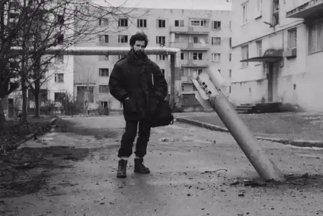 Российский журналист у снаряда РСЗО на улице Грозного, Чечня, 6 января 1995 года.