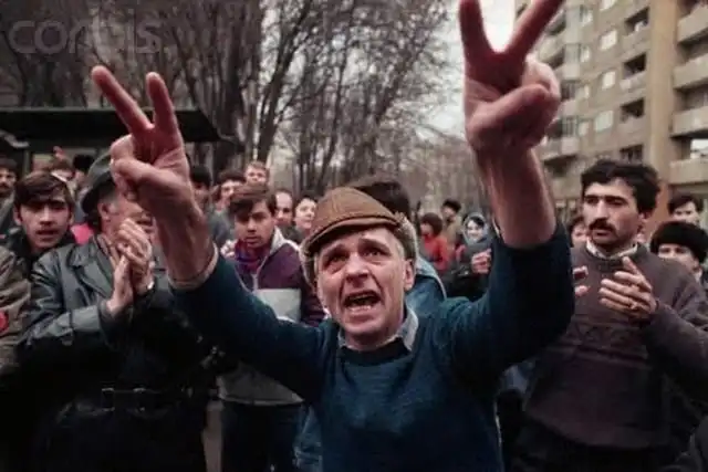 Люди празднуют смерть Николае и Елены Чаушеску. Бухарест. Румыния. 1989 год.