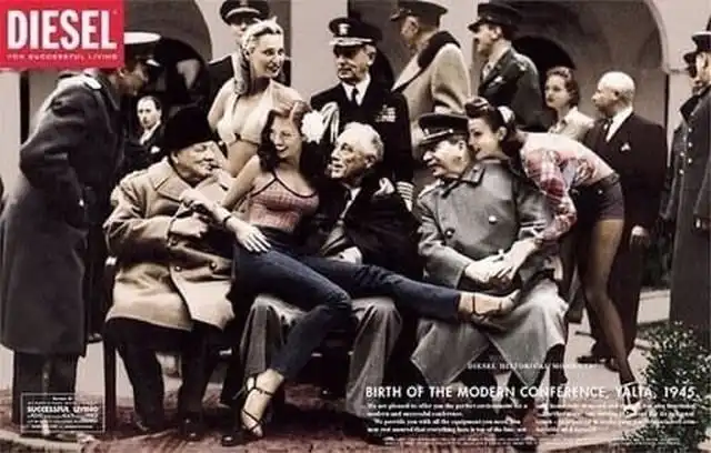 Лидеры Большой тройки Черчилль, Рузвельт и Сталин в рекламе джинсов Diesel. 1997 год.