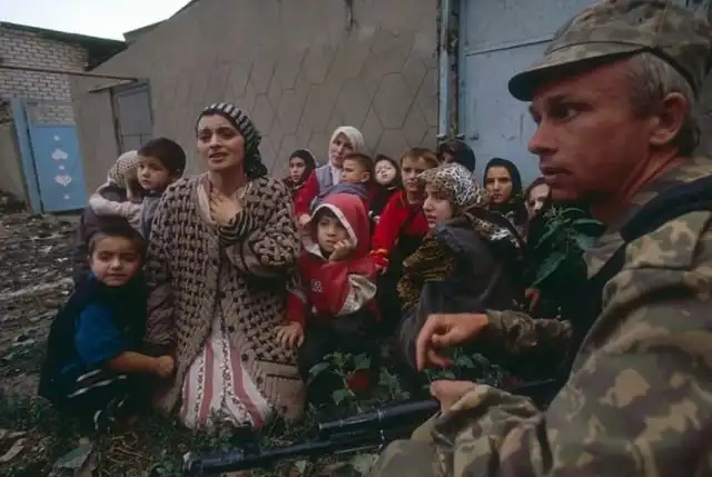 Российские солдаты освобождают группу женщин и детей, захваченных исламистами в Буйнакском районе Дагестана. Вторая чеченская. 1999 год.