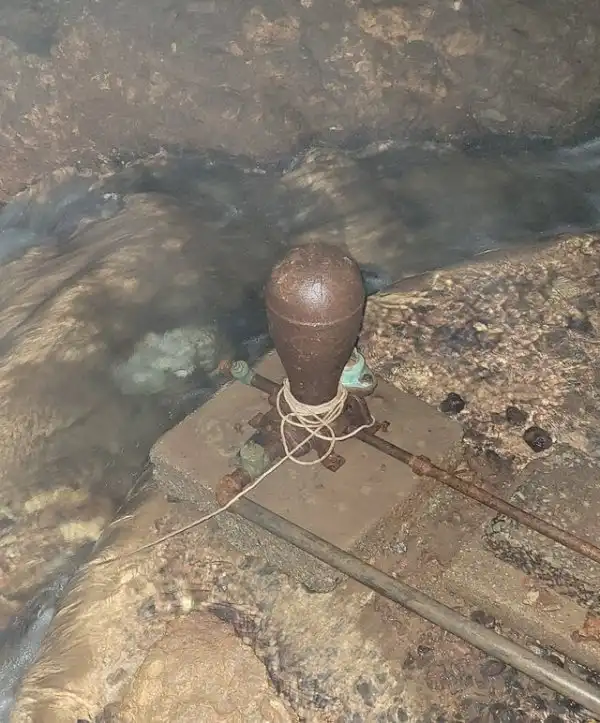 Ответ: Это разрушенный трубопровод из дерева, который мог использоваться для осушения шахты.