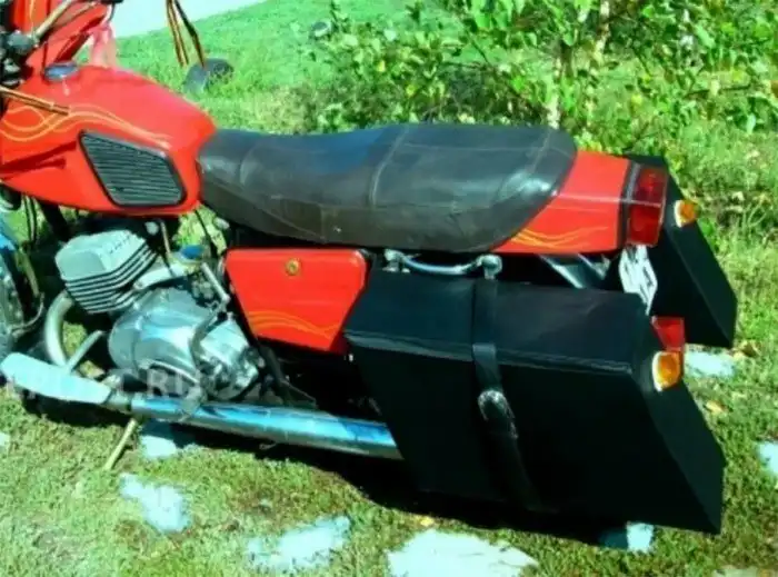 Соединили их последовательно и подключили вместо штатного динамика магнитофона. Естественно звучание было гораздо громче!Отсоединил от переключателя микрофона провода (внешним микрофоном мы все равно никогда не пользовались) и завел на него провод с выхода усилителя. Теперь можно было переключать кнопкой между внутренним и внешними динамиками. Внешние динамики подключались через разъем СШ-5 в гнездо микрофона. Чтобы случайно коротким замыканием не спалить усилитель, использовал контакты 1 и 3.Валера сделал из фанеры две сумки на мотоцикл типа таких: