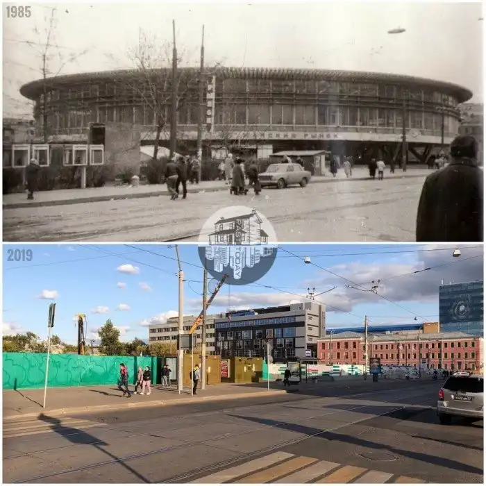 Но на фото 1985 г его нет. По информации из разных источников здание возведено только после 1996 г. , на месте хоккейной коробки соседней школы.