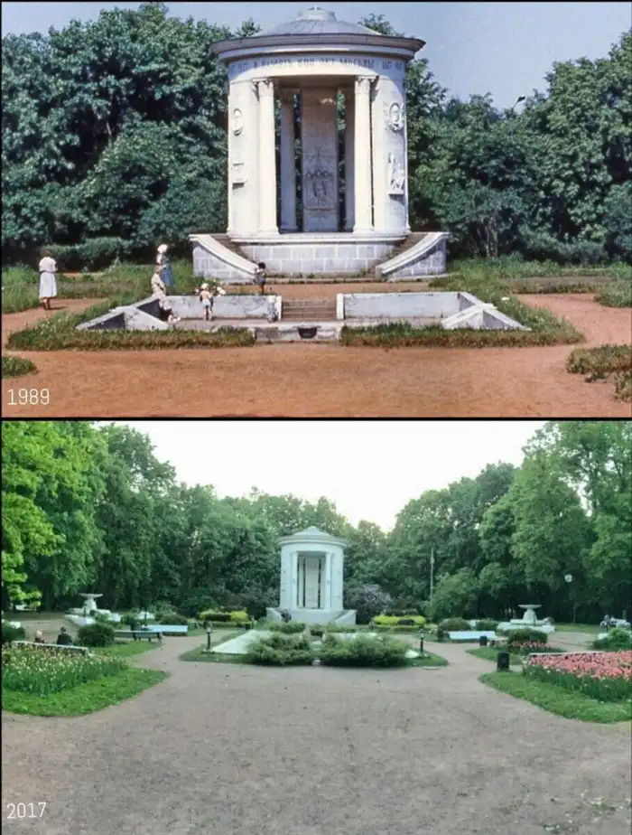 Эта беседка-ротонда в Нескучном саду была построена в 1951 г. в честь юбилея города (800 лет). Указ о строительстве в 1947 году подписал Сталин.