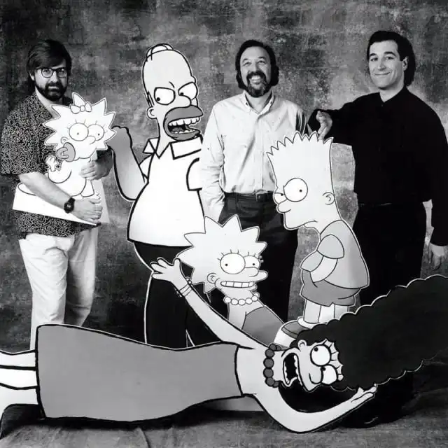 Создатели сериала "Симпсоны" Мэтт Гроунинг, Джеймс Брукс и Сэм Саймон вместе с героями мультика, 1990 год.