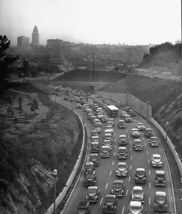Автомобильный трафик Лос-Анджелеса, Калифорния, март 1949 года.