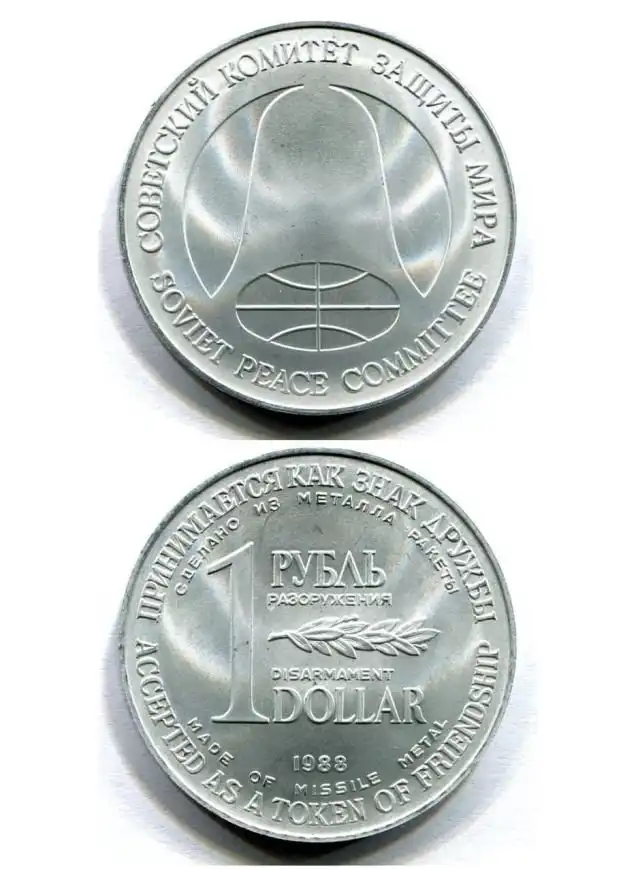 "Монеты разоружения" номиналом в 1 рубль-доллар. Их отчеканили в СССР в 1988 году из материала ракет средней дальности Р-12 (8К63), уничтоженных по Договору с США.