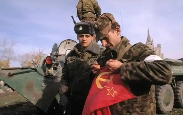 Офицер Таманской дивизии рвёт снятый с Белого дома советский флаг. 1993 год, октябрь.