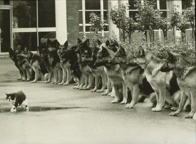 Кот и трeнированные немецкие овчарки - финальный экзамен для служебных собак полиции. ФРГ, 1987 год.