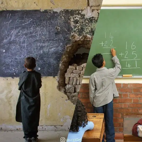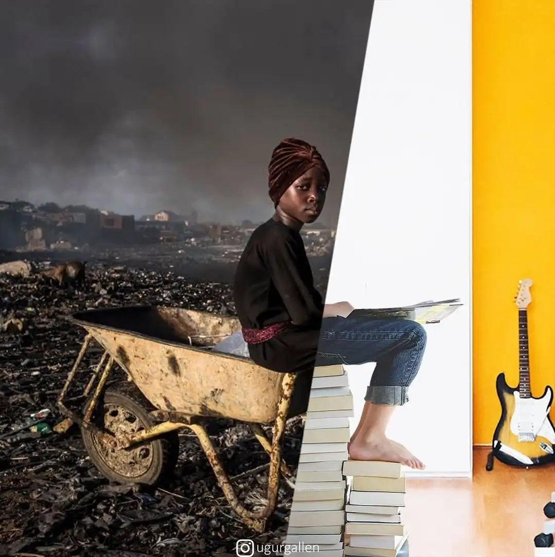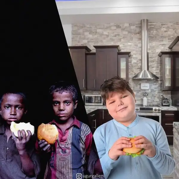 Турецкий художник Угур Галлен демонстрирует чудовищные контрасты между этими двумя частями нашей планеты, объединяя две контрастные фотографии в один душераздирающий образ.
