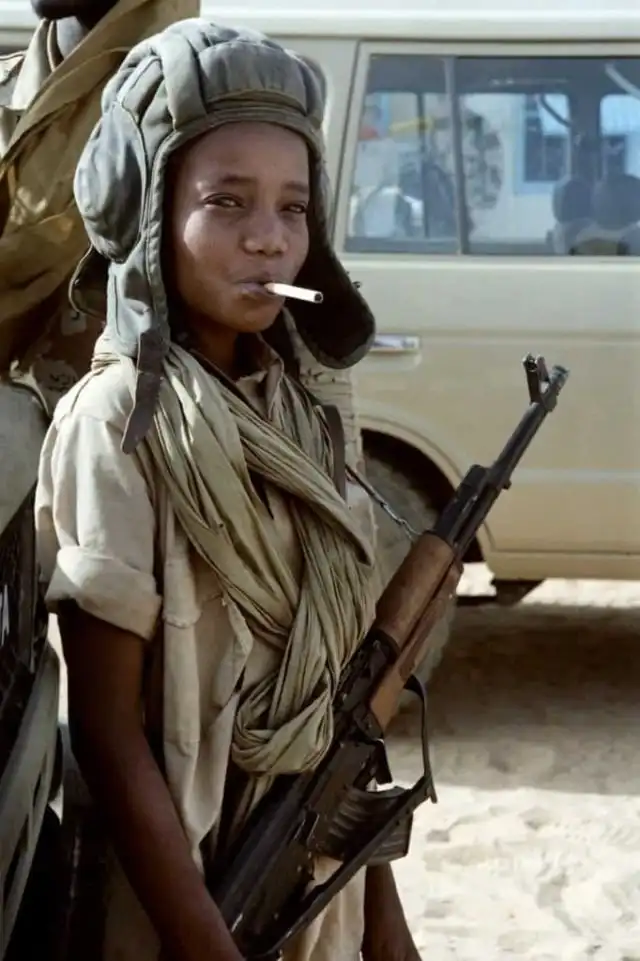 Молодой боец на перекуре после изгнания ливийских войск из пограничного городка. Чадско-ливийский конфликт, 1987 год.