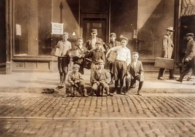 Группа чистильщиков обуви на Боудойн-сквер (популярная работа для несовершеннолетних). Бостон, Массачусетс. Октябрь 1909 года.