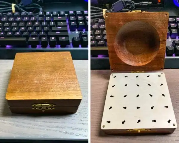 Ответ: Это, по-видимому, тест на оценку ловкости рук, используемый в нейропсихологии для оценки мелкой моторики. Случайные замочные скважины нужны для того, чтобы испытуемый по-разному вставлял ключи в отверстия и по-разному их вращал. В деревянном углублении крышки должны были храниться 25 маленьких ключей.