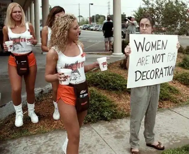 Официантки рeсторана Hooters выносят воду протестующим феминисткам, США, 2000-е
