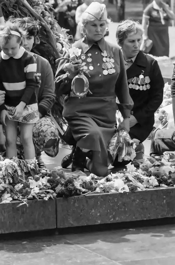 6. День Победы. Ветераны Великой Отечественной войны у могилы Неизвестного солдата в Александровском саду Московского Кремля. Фото А. Князева, 1970-е.