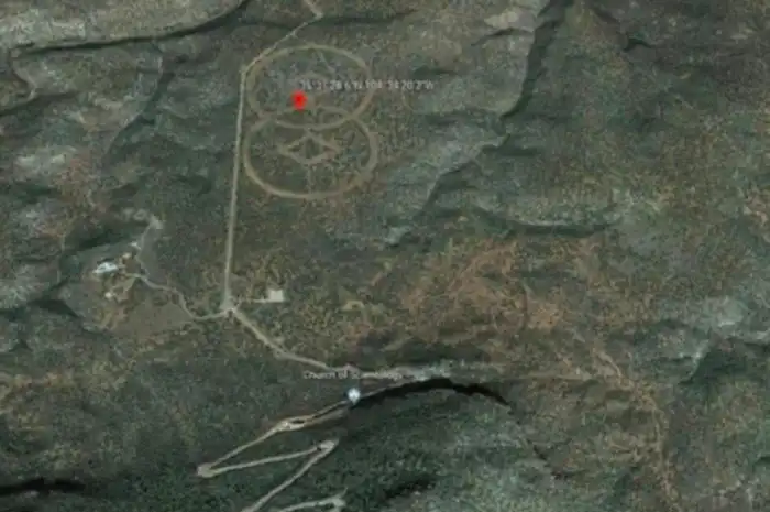 Эти знаки недалеко от Меса Уэрфанита, штат Нью-Мексико, США, напоминают работу инопланетян. Но на самом деле, этот символ нарисовали саентологи - последователи религиозного движения. Знаки указывают на бункер, который был построен для хранения работ Л. Рона Хаббарда - писателя-фантаста, который основал церковь в 1950-х годах.
