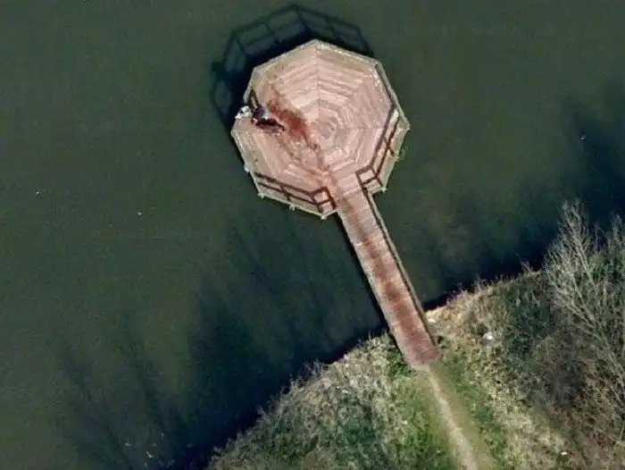 Это фото из Google-карт долго блуждало по сети - все думали, что это место убийства, где "окровавленное" тело тащили по пирсу в воду. Детективы, разойдитесь. На деле это всего лишь след мокрой собаки, которая вышла из воды и побежала на берег к хозяину.