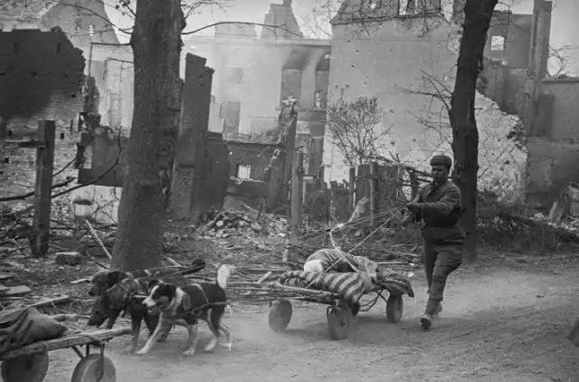Апрель 1945 года. Зееловские высоты, Германия. Раненых солдат эвакуируют на собачьих упряжках.