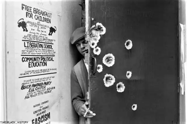 Офис «Черных Пантер» в афроамериканском квартале Чикаго. Полиция взяла его штурмом после того, как несколько полицейских получили ранения в результате стрельбы из верхних этажей здания. 1968 год