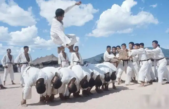 38. Южнокорейские солдаты тренируются в тхэквондо на базе в Южном Вьетнаме во время войны. 1960-е