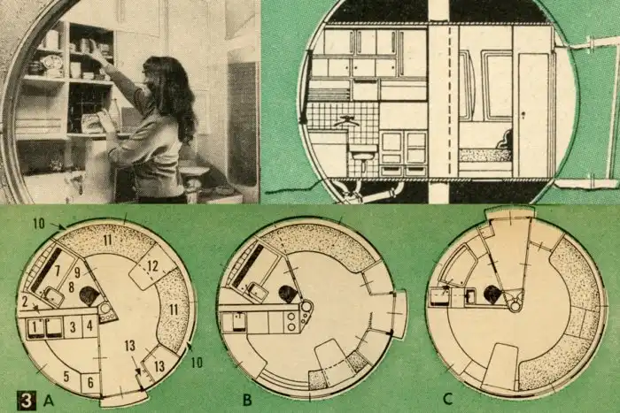 Один из первых "тестовых" экземпляров был всего 4,5 метров в диаметре и площадью чуть менее 16 квадратных метров. Но внутри каким-то образом поместились гостиная-кухня, ванная, спальня и коридор с большими окнами.Судя по всему, были идеи делать такие дома в пару этажей - тогда полезная площадь увеличивалась бы более, чем в два раза (если делать второй этаж по "экватору").