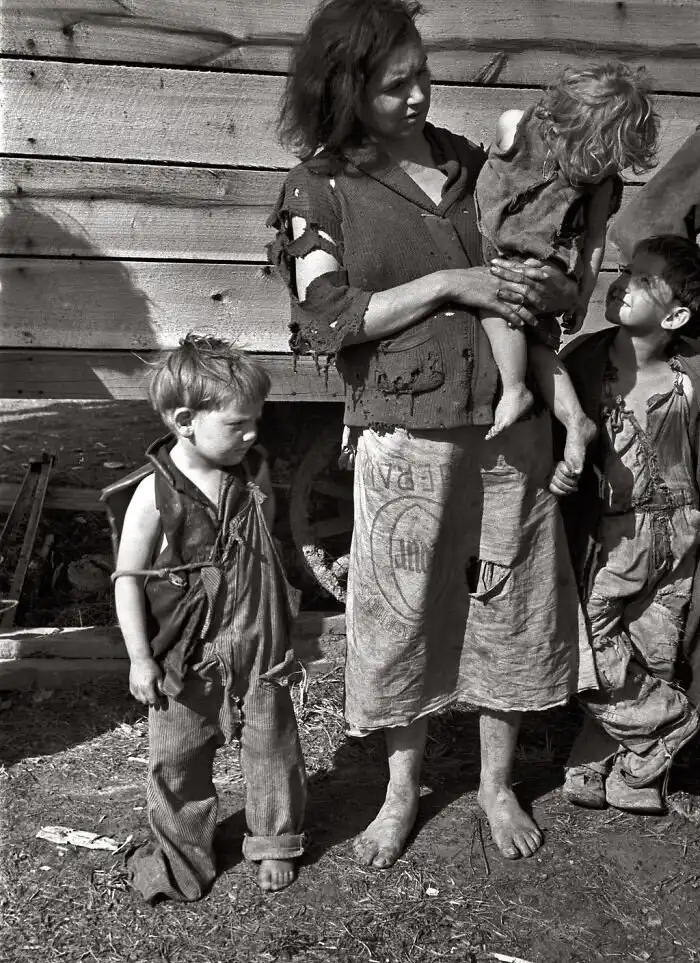 22. Семья из матери и девяти детей, живущая в поле на американском шоссе 70 у реки Теннесси, март 1936 года