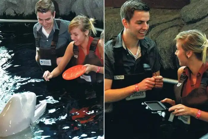 Эти ребята отправились в аквариум Шедда в Чикаго, чтобы пообщаться с белухами – ее самыми любимыми животными. Парень договорился с руководством, чтобы одна из белух принесла девушке коробочку. Открыв ее, она увидела там записку и кольцо.