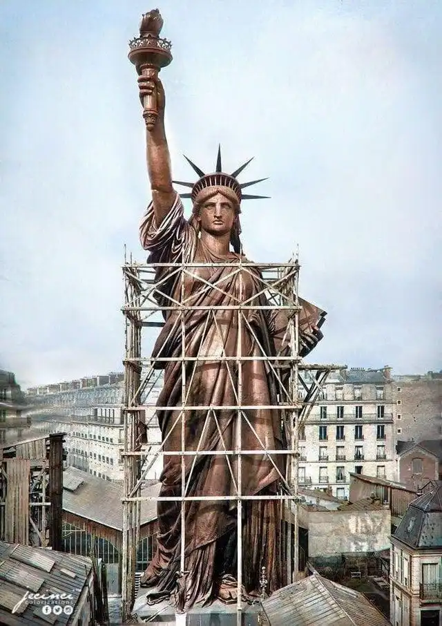 Цветное фото, со Статуей Свободы, в Париже, в 1886 году (до транспортировки в Америку).