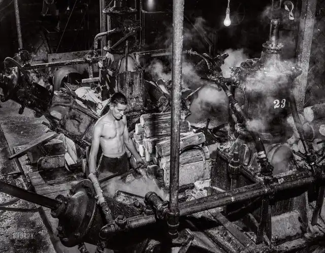 Одна из машин, перемалывающих древесину в целлюлозу на бумажной фабрике Mississquoi Corporation в Шелдон-Спрингс, Вермонт. Сентябрь 1941 года.