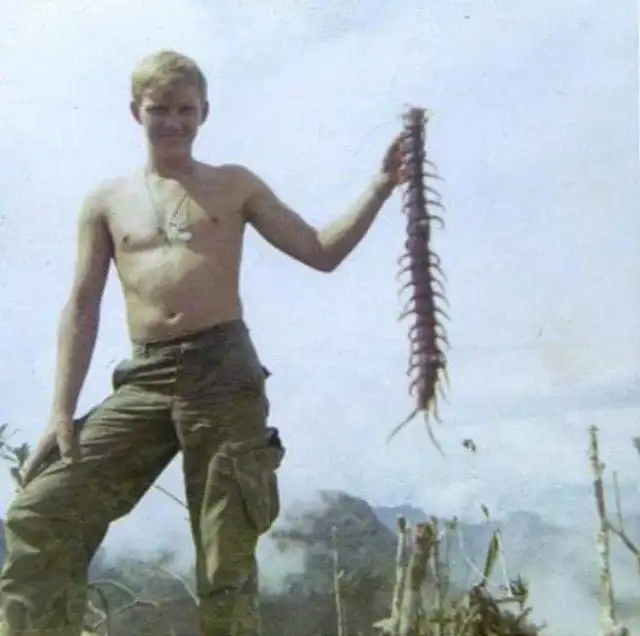 Американский солдат и пойманная во вьетнамских джунглях сколопендра, Вьетнамская война.